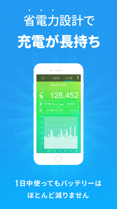 グラフ機能を搭載しているので、毎日の歩数がひと目でわかります。大きく表示されているため見やすいのが嬉しいところ。また歩数記録は1日、1週間、1ヶ月ごとにチェックできます。