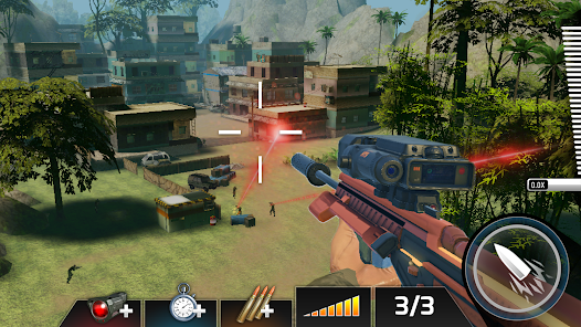 仮想パッドで照準を合わせ、弾丸ボタンをタップして射撃。指定された敵を撃ち抜けばステージクリアです。通常は広い範囲を見渡せますが、スコープを覗き込むことで標的をズームして狙撃可能。キルの瞬間はスローで映像が流れ、迫力はバッチリです。