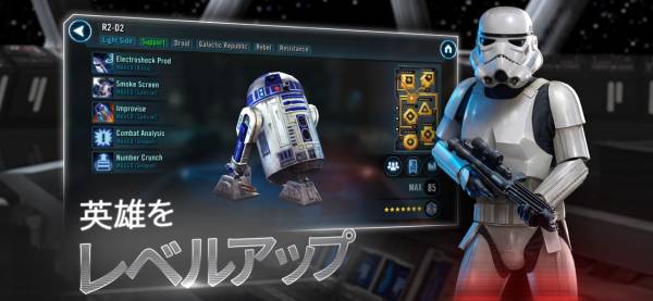 キャラクターの固有スキルも魅力たっぷり。例えばチューバッカなら特徴的な声を上げて敵を挑発したり、オビ=ワン・ケノービならフォースの力で敵の攻撃を力を低下させたりできます。好きなキャラをとことん育成していきましょう。