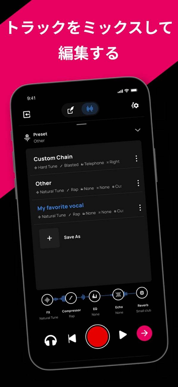 録音したサウンドに、さまざまなエフェクトをかけられます。「酔っぱらい」などのおもしろ効果から、「ゴースト」などの不気味な効果まで、50以上のエフェクトを収録。誰でもスタジオサウンドのような本格的な編集ができます。
