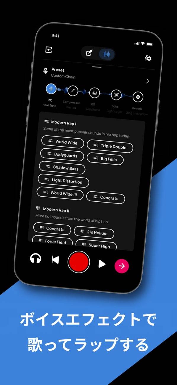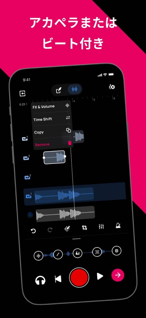スタジオサウンドのようなレコーディングができるアプリです。エフェクトの種類が豊富にそろっており、シーンに合わせて50以上の効果から選べます。またディスコやレゲエなど、ジャンル別のビートを無料で使えるのが特徴。
