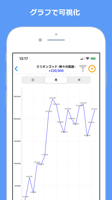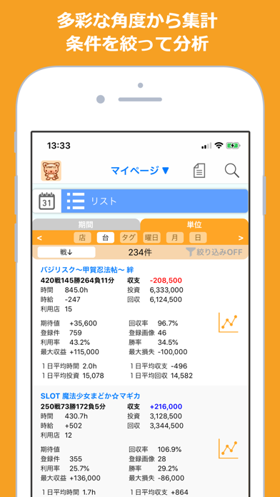 パチンコやスロットの収支記録を一括で管理。操作は直感的で、店舗や機種を選び、数字を打ち込むだけ。あらゆる角度からのデータ分析も可能で、グラフでの確認が行えます。曜日や期間別の傾向も一目瞭然で、収支の流れを手軽に把握できます。