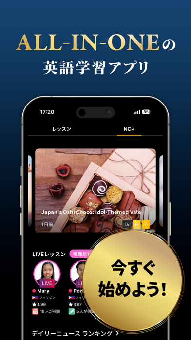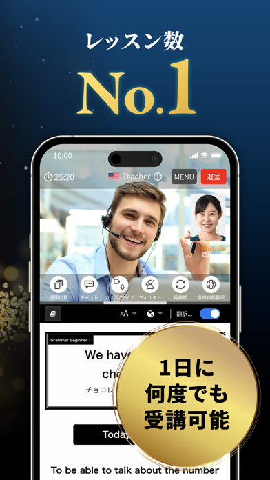 スマホで英会話のレッスンが受けられるアプリ。無限に練習できるシステムで、英語力を存分に伸ばせます。世界各国の講師とリアルタイムで会話が楽しめ、時間を気にせずレッスン可能。英語について学べるコラムや動画も豊富であなたに合った学び方で学べます。