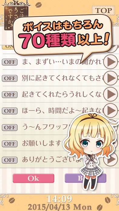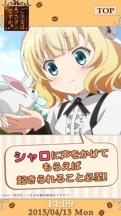 『ご注文はうさぎですか?』のメインキャラの1人、桐間紗路(シャロ)のボイスが収録されたアラームアプリです。本アプリのための、内田真礼さん録り下ろしボイス多数。もう朝から心がぴょんぴょんしますね。