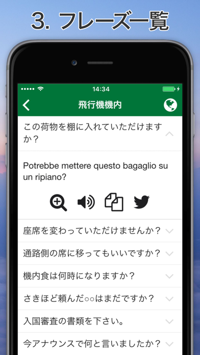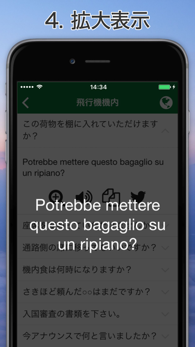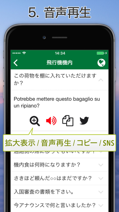フレーズを拡大して見やすく表示できます。拡大表示させて相手に見せることで、現地でのコミュニケーションがより簡単に行えます。イタリア語がまったくわからなくても、イタリア旅行を楽しめるでしょう。