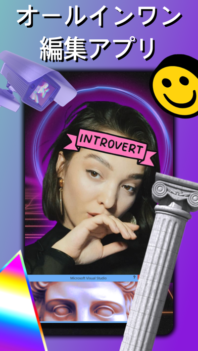 個性的な作品を作れる写真・動画編集アプリです。パソコン、彫刻、魚、神社、デコ文字など、ほかではあまり見られない独特なステッカーが豊富にそろっています。ショップロゴやスタイリッシュな自撮り写真、映画の制作など、このアプリひとつでさまざまな作品を作ることが可能です。