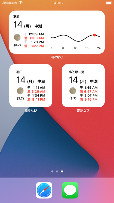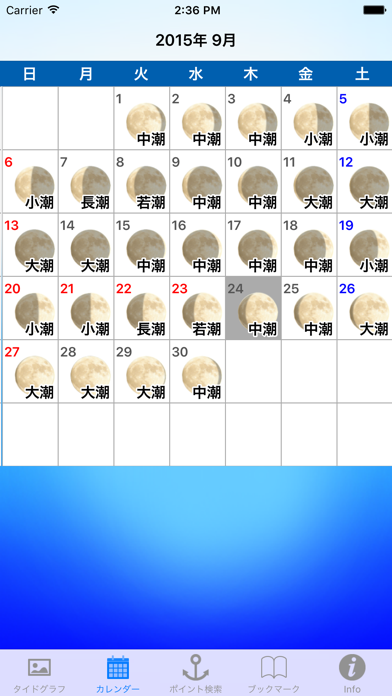 日本全国の潮汐情報(タイドグラフ)や月の満ち欠けを表示してくれるアプリです。タイドグラフは波の一番高い所が満潮、低い所が干潮となっているので、非常に見やすくなっています。またカレンダーで1カ月ごとの潮の満ち引きを確認することも可能。