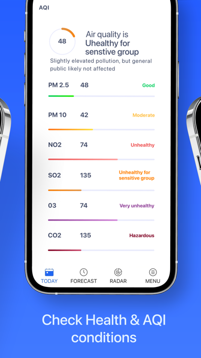 花粉やPM2.5など空気汚染物質の飛散状況がわかります。特にアレルギーや呼吸器系の問題を抱えるユーザーが、外出時の健康リスクを事前に把握し、必要な対策を講じることができます。