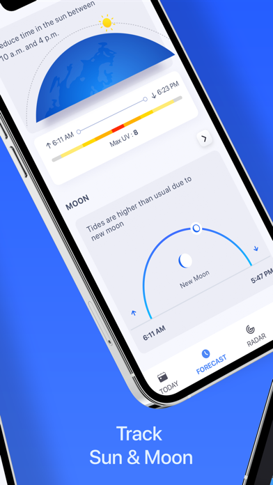 情報量が多いこともこのアプリの特徴と言えるでしょう。温度1つとっても、現在の気温が大きく表示され、最高気温と最低気温、1時間ごとの気温、体感気温など、情報は多岐にわたります。珍しいところとしては、今日の日照時間や月の形や視程なども表示されます。
