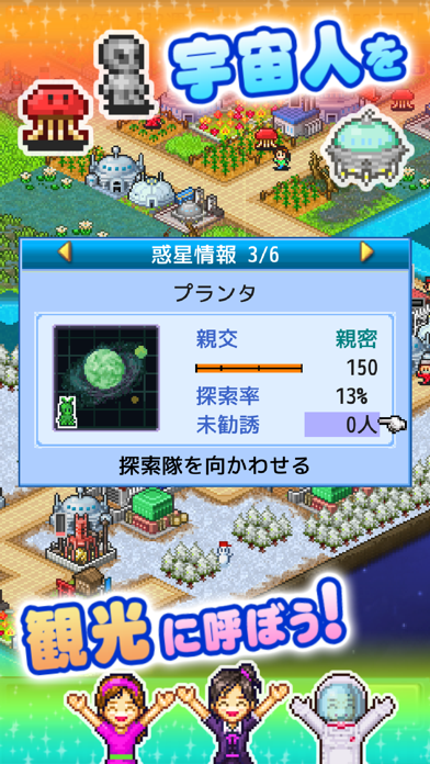 道路や住宅を建設して、住民たちが快適に過ごせる環境を整えていきましょう。惑星は探検していく事で少しずつエリアが拡大していきます。洞窟の中には危険なモンスターが潜んでいる事も!住民たちを武装させて突撃させましょう。戦闘はオートで進むので楽チン。洞窟探検が完了すれば、名声を聞きつけてさらに移転希望の住民が増えていきます。