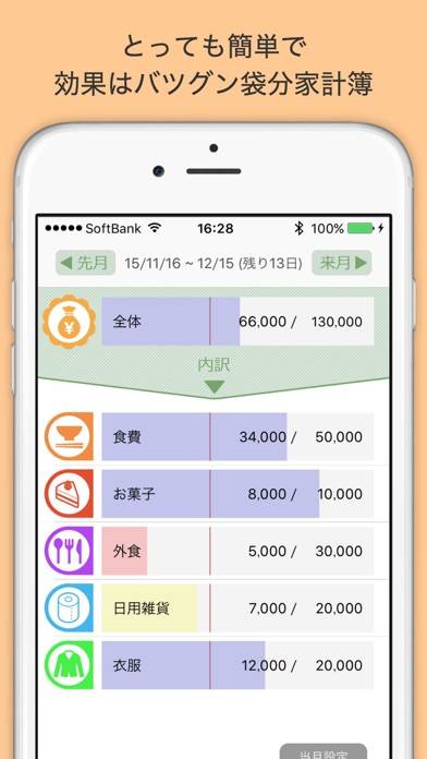 生活費を袋分け(カテゴリごとに金額を設定)して管理でき、節約がしやすくなります。ウィジェットから手軽に入力でき、電卓機能で計算もラクラク。