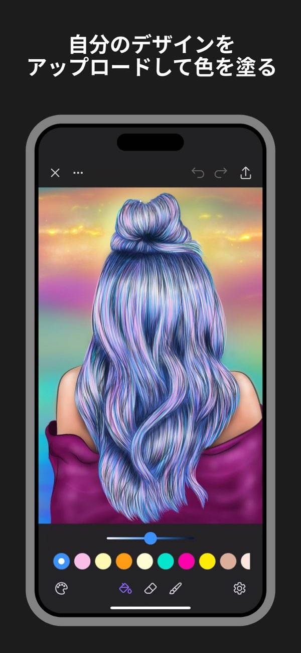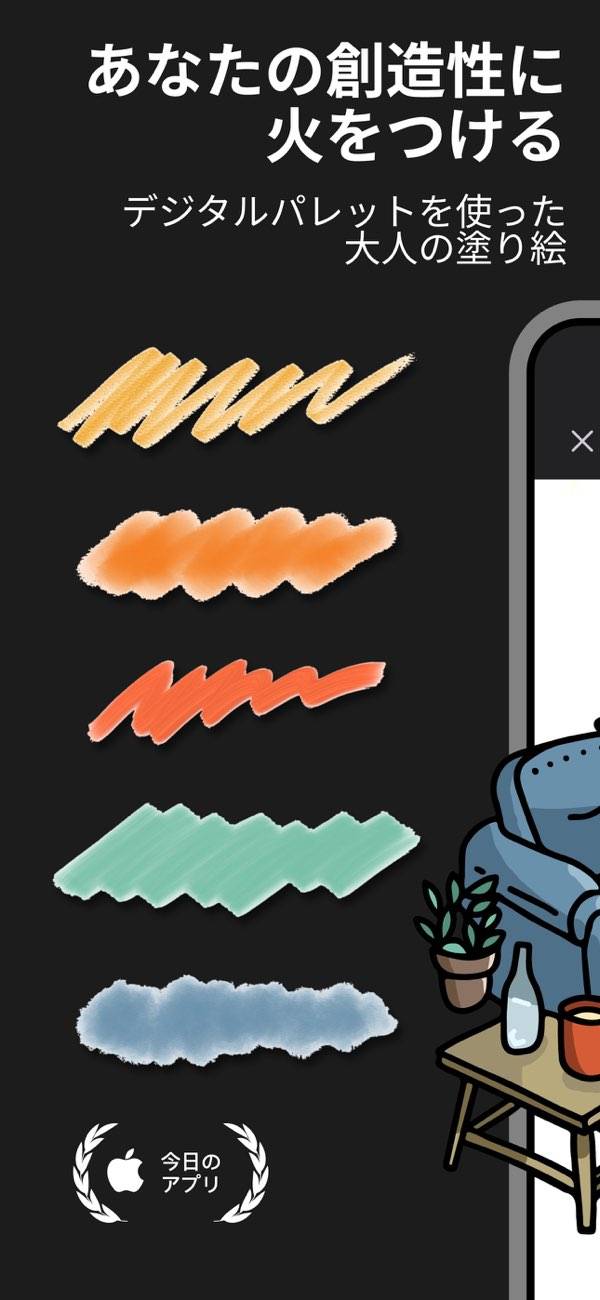 塗り絵ができるアプリ。ペンの種類がいっぱいあるし、パレットの色を自分好みに微調整できるのが良い。
