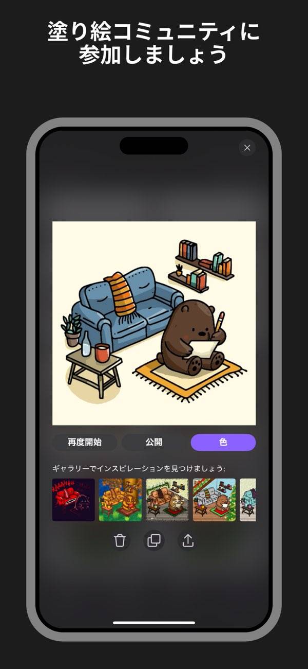 - マーカーや水彩ブラシで、にじみ・陰影を表現できる塗り絵アプリ