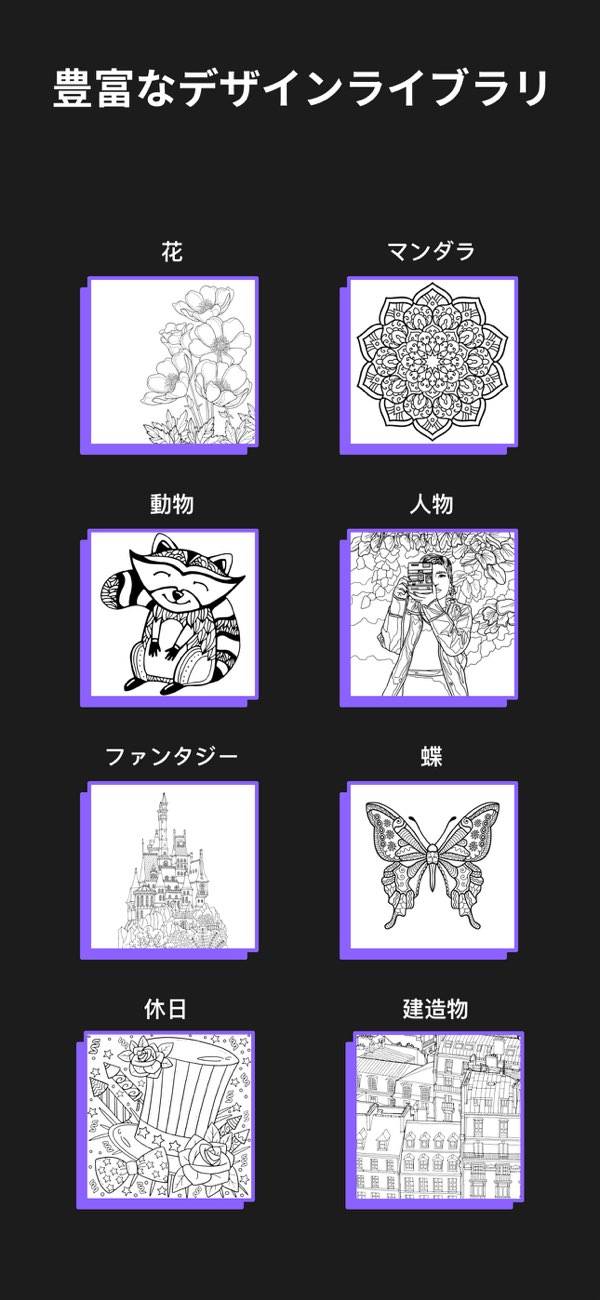 塗り絵アプリを探しており、主にキャラクターや人物画を塗ってみたいという人におすすめ。海外のクリエイター達が手掛けた、個性豊かな塗り絵が多く収録されています。