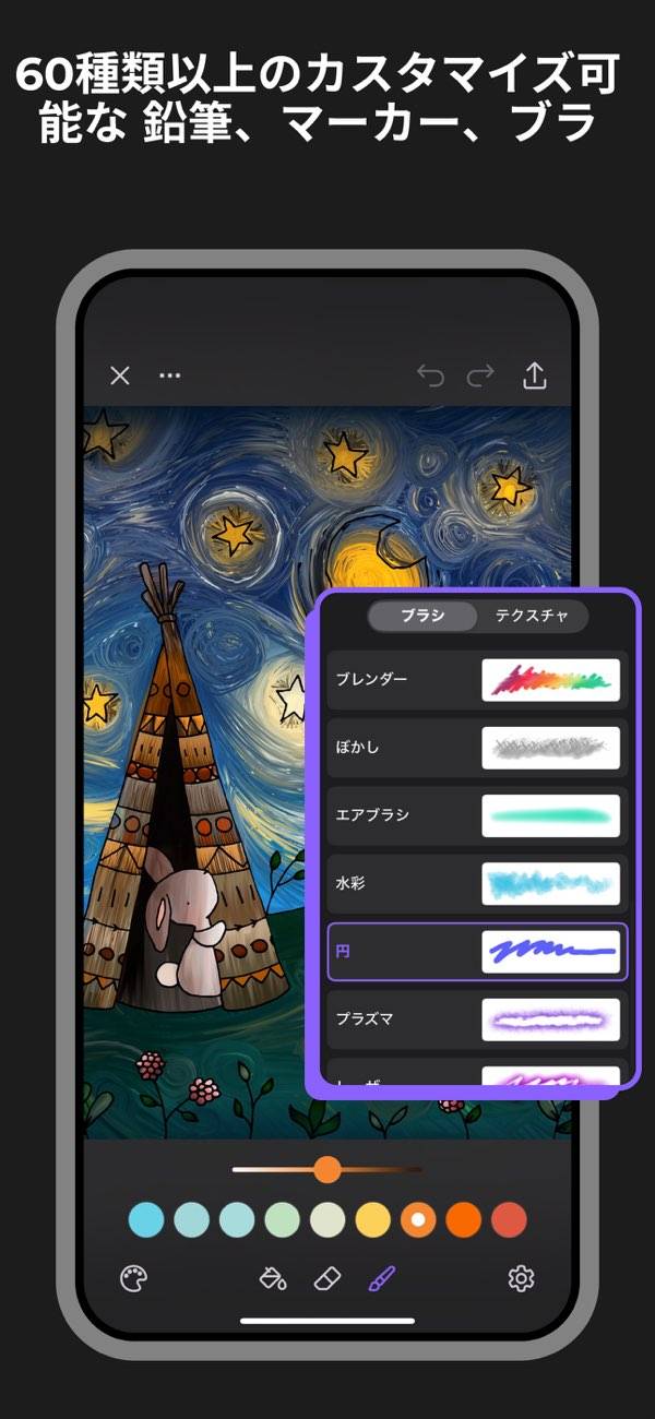 線に捕らわれない自由な”塗り”を 多彩なブラシツールで自分を表現