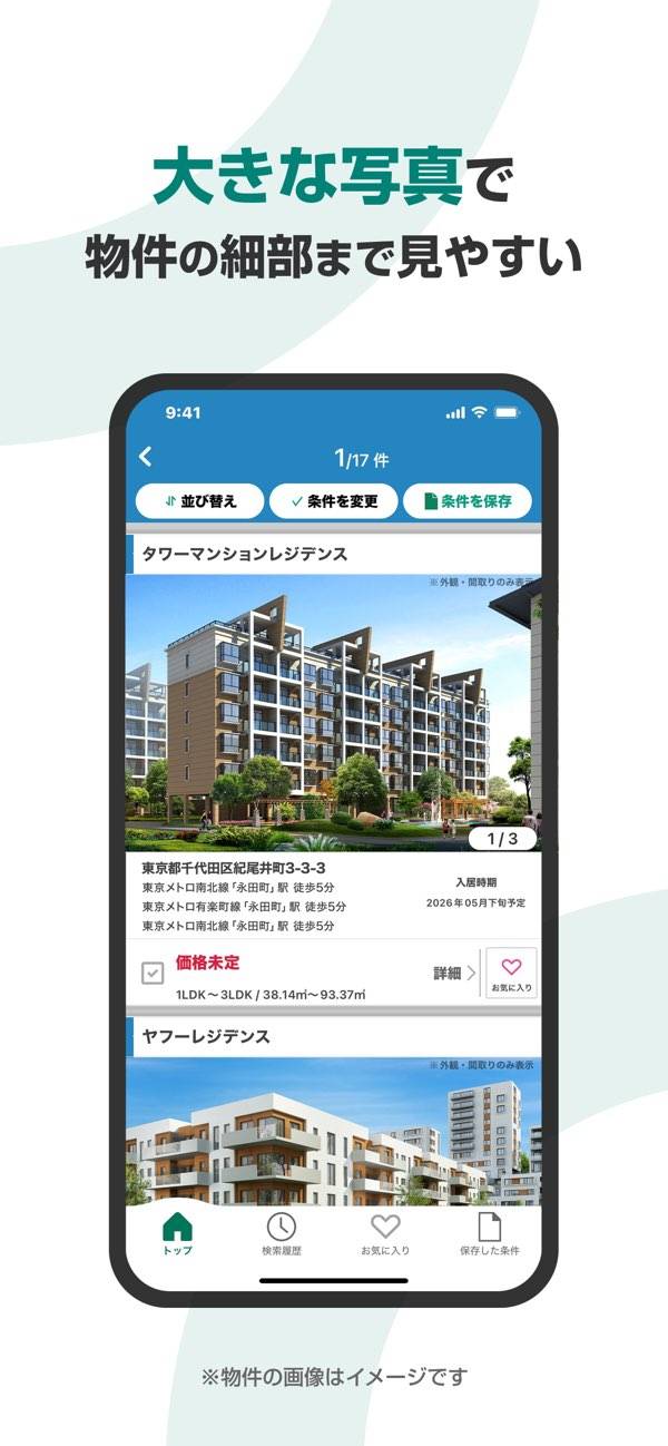 新築マンションから賃貸物件、一戸建てまであらゆる物件情報を探すことができます。写真付きの詳細な情報と細やかな検索条件設定。あなたのライフスタイルや予算にピッタリ合った物件を効率的に探すことが可能です。