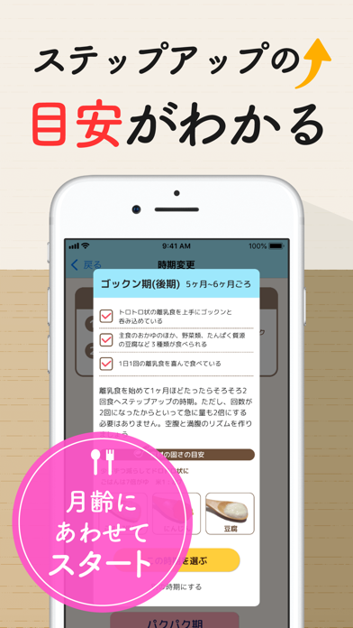 - ゴックン期・モグモグ期など、発育ごとの「食べていい」食材がわかる