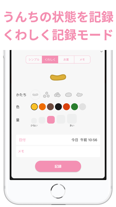 便の硬さや色、量などを細かく利用できます。日付と時間は自動で入力されるため、毎回の記録が簡単。メモには「身体が冷えていた」「水分不足」など書き込んでおけば、生活改善の意識も高まるでしょう。