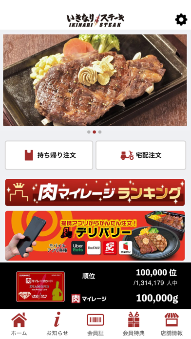 会員特典やお得なマイレージを貯められる「いきなりステーキ」公式アプリ。お持ち帰りや宅配の注文もアプリから行えます。店舗情報や期間限定の情報まで掲載されているので、いきなりステーキをよく利用する人は、インストールしておいて損はないでしょう。