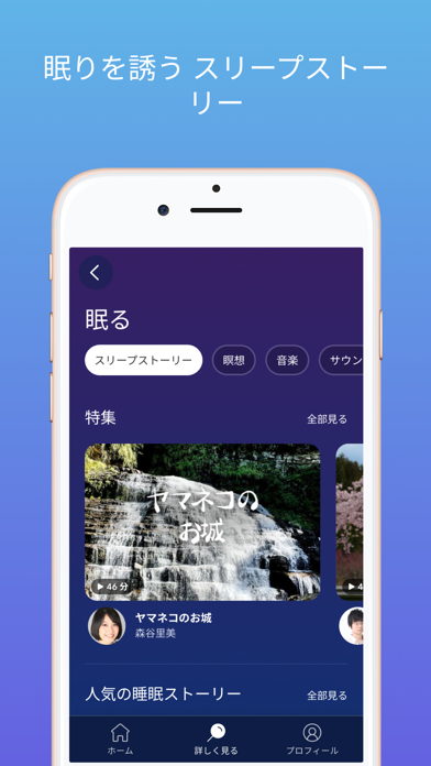 寝る前に聞くと心地よい眠りへと導く「スリープストーリー」も特色のひとつ。落ち着いた声で、エッセイ調の文章やストーリー性のある文章を朗読してくれます。キッズ向けのストーリーや旅行に関するエッセイなど多くの種類があります。