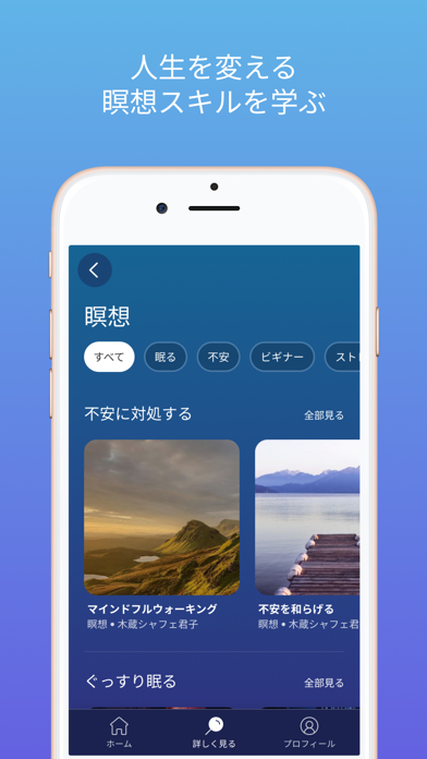 心身のリラックスを助け、日々のストレスを軽減。ガイド付き瞑想や心地よい音楽で良い眠りへと導きます。瞑想では集中力を上げるなど目標にもとづいた適切なプランを提案してくれます。音声ガイドは安心の日本語。