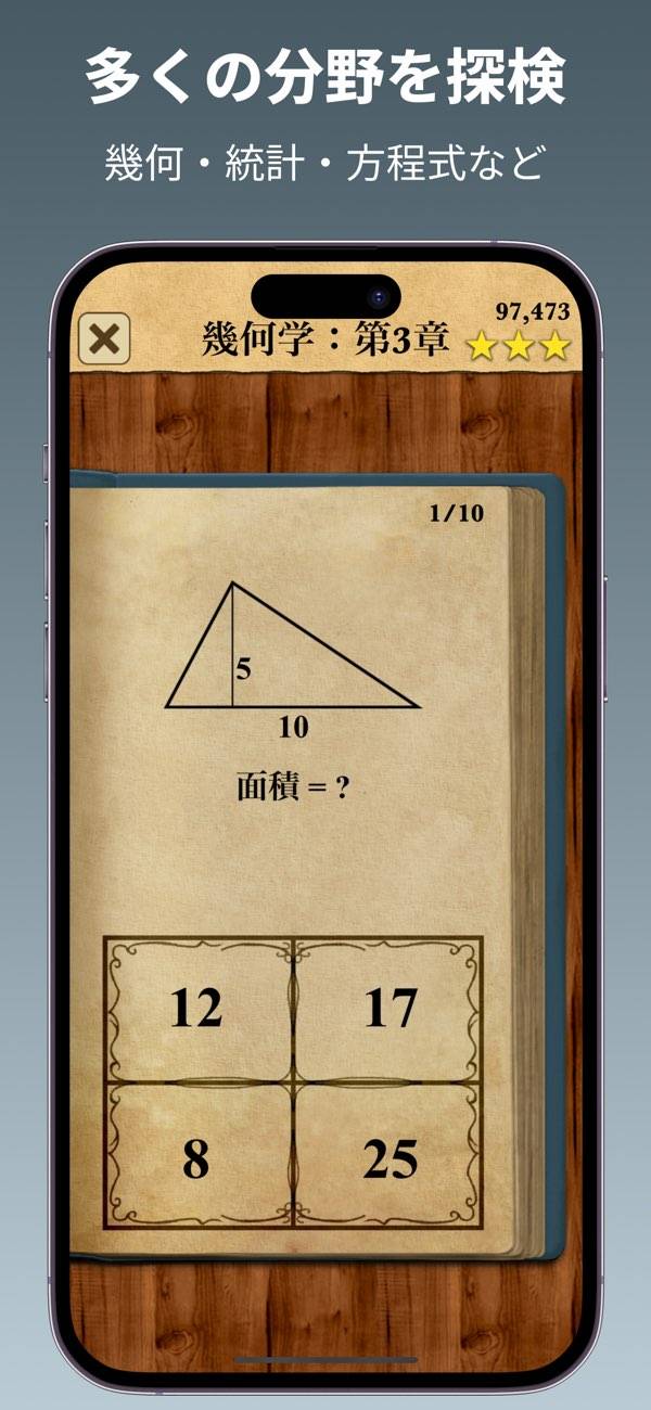 「数学の王者: フルゲーム」は、数学にまつわるクイズを提供するゲームアプリです。iPod Touchでも遊べます。遊べるゲームは、四則計算に始まり、幾何学や累乗、統計など中学生レベルまでの内容で仕上がっています。