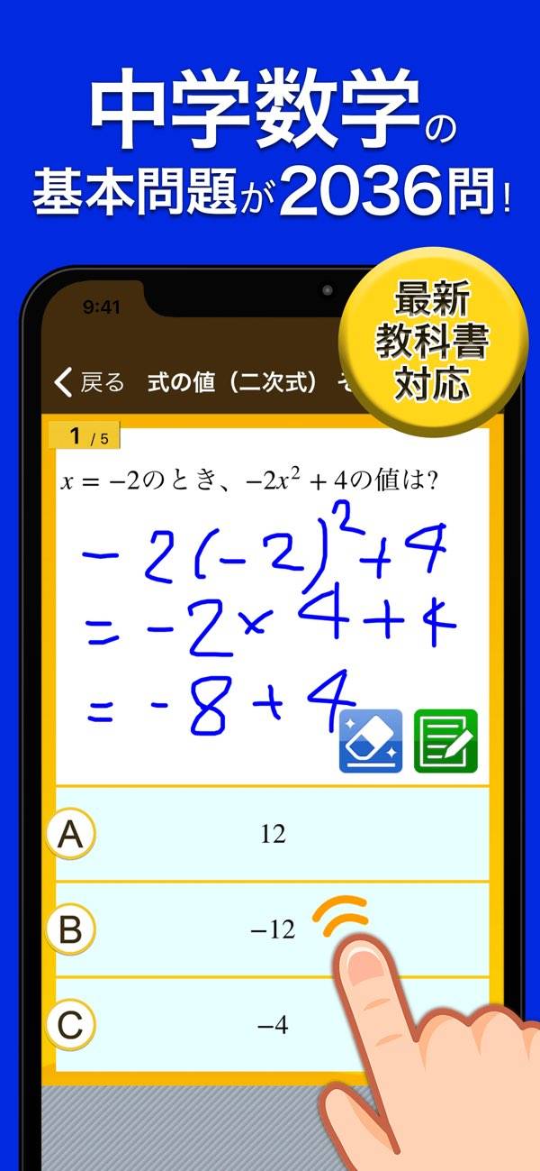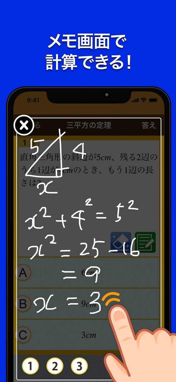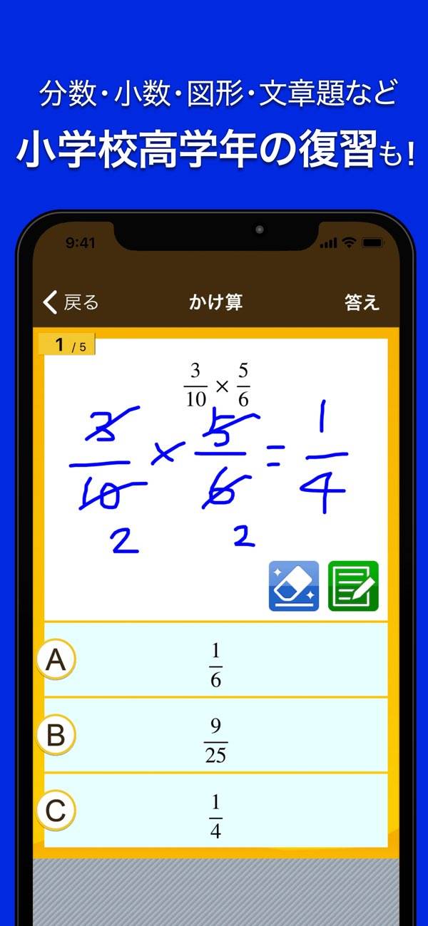 カリキュラムに沿った問題集で、計算から図形まで幅広い分野の習得が可能。どの分野からでも学習できるので、自分の苦手な問題を集中的に攻略。また解答後の丁寧な解説で理解を深められます。手書きメモ機能を使えば、紙とペンを使わずに途中式を記録。