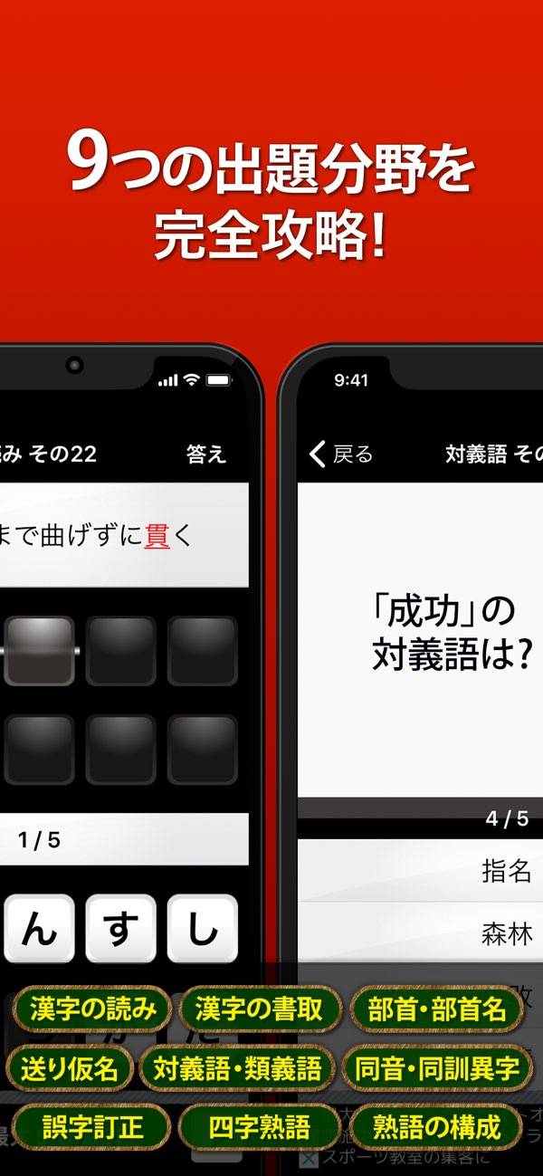 全部で9つの分野に分かれており、苦手な分野を重点的に勉強できます。漢検3級の問題は網羅されており、本気で合格を目指す人におすすめ。何度もチャレンジして正解率を高めましょう。