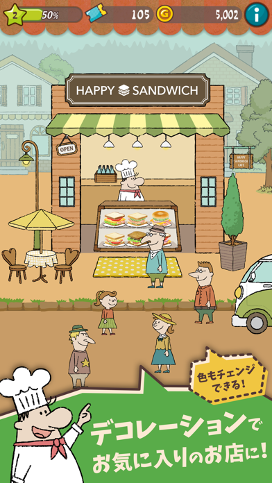 おいしいサンドイッチを作ってたくさんお客さんを呼んで。。。ついつい夢中になるゲームです✨ ミニゲームもあり、無課金でも充分遊べて楽しいです❗️たまには自分のペースでのんびりやるゲームもいいですよ? 音楽も絵もほっこり?