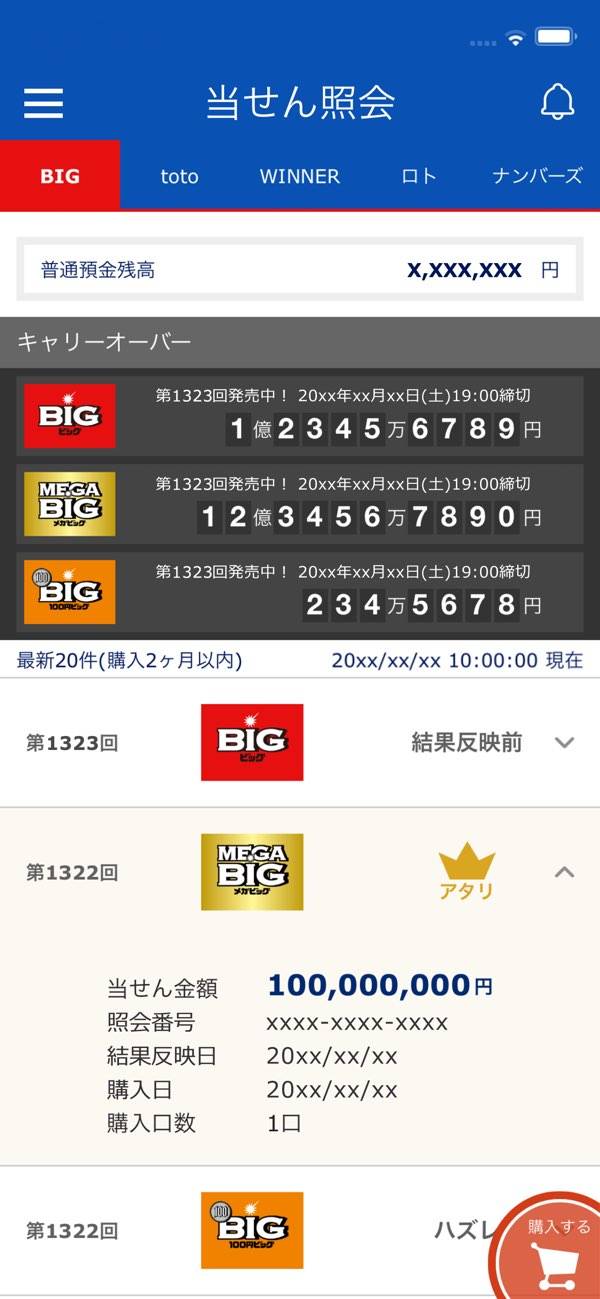 - BIGやロト、ナンバーズくじの購入ができる宝くじアプリ