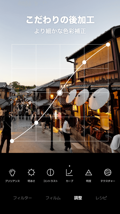 このアプリには、ほかの人が撮影した写真を参考にできる機能があります。各ページには、撮影された写真と、フィルターや明るさ・彩度・コントラスなどの調整内容も表示。「撮影」ボタンをタップすれば、その調整を適用した状態で撮影することが可能です。