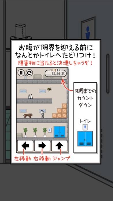 漏れる前にトイレを探し出すゲームです。障害物に当たったらゲームオーバーです。右・左・上のボタンで操作ですが、思ったより難しいです。立ち位置が悪いとぶつかってジャンプ出来なかったり。横スクロールなので先も分かりにくく迷路の様なので、制限時間内に到着すると本当にホッとします‼︎
