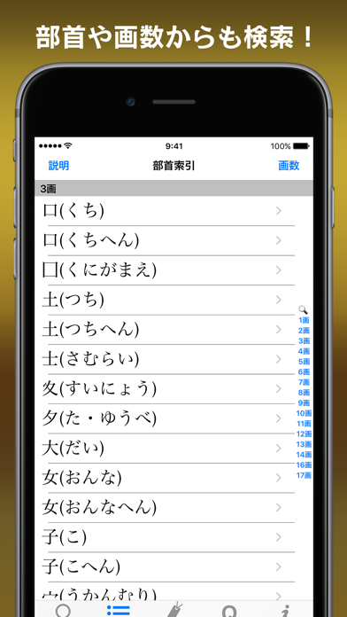 - 部首や音読み訓読みなどを掲載。簡単な漢字辞書としても重宝する