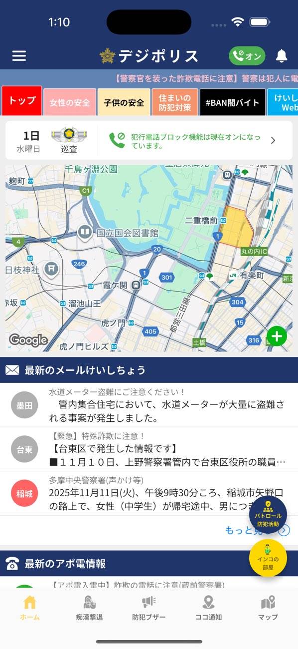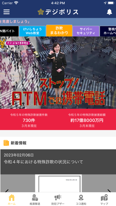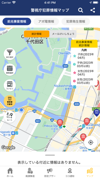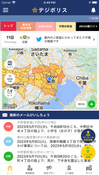 本アプリでは警視庁から事件の情報が公開されています。情報は東京都内に限定されているものの、リアルタイムで更新されていくため、危険な場所や危険人物の把握がしやすくなっています。