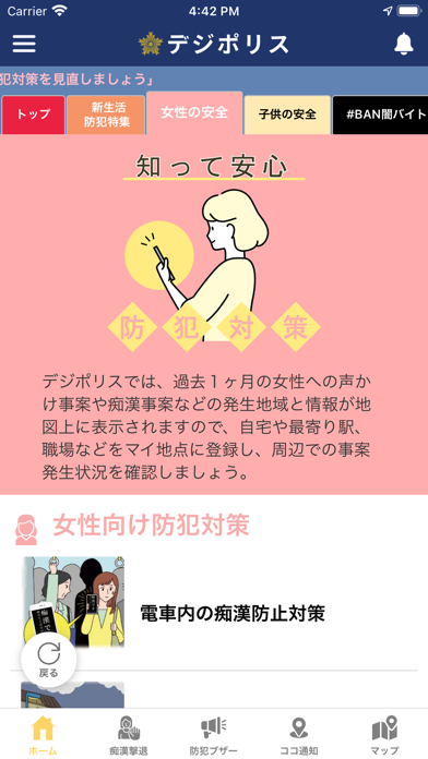 • 防犯や痴漢に関する記事が多数。知識を身につけて自分の身を守れる