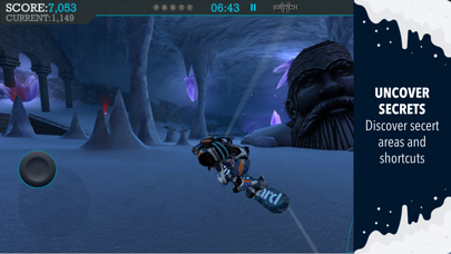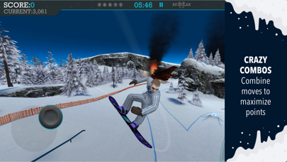 画面左下のスティックを操作して左右に舵を取ったり、前に傾けて加速したりしましょう。そしてジャンプ台が近づいてきたら、ジャンプして右側のアクションボタンで指示。華麗に技をキメてかっこよくゴールまで滑りきりましょう。