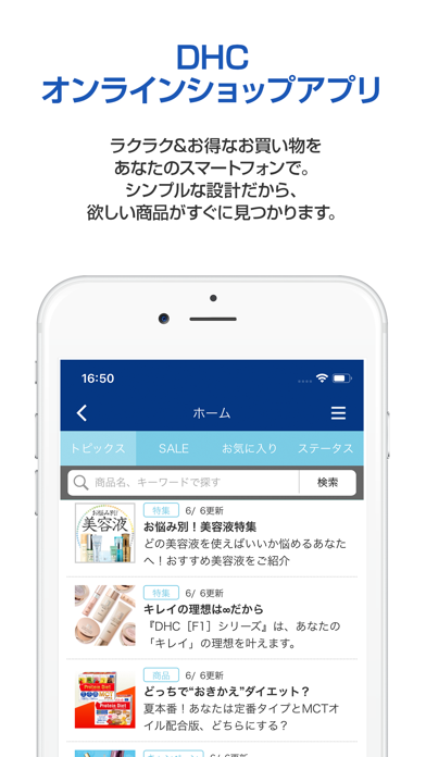 お手軽に美容と健康をサポートするショッピングアプリ。化粧品やダイエット食品などDHCの商品がそろっています。さらに限定セールやクーポンをプッシュ通知で受け取ることで、お買い物がいっそうお得に。