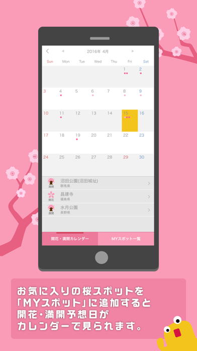 行きたい場所をMyスポットに登録すれば、開花日・満開日をアプリ内カレンダーに表示させることも可能。お花見の日程を決めやすくなるでしょう。