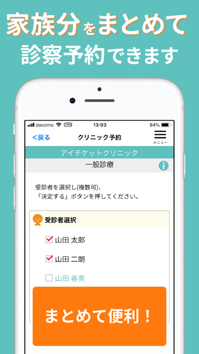 - 最短3クリックで予約ができ、家族全員の診察予約も一度に可能