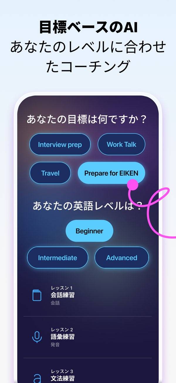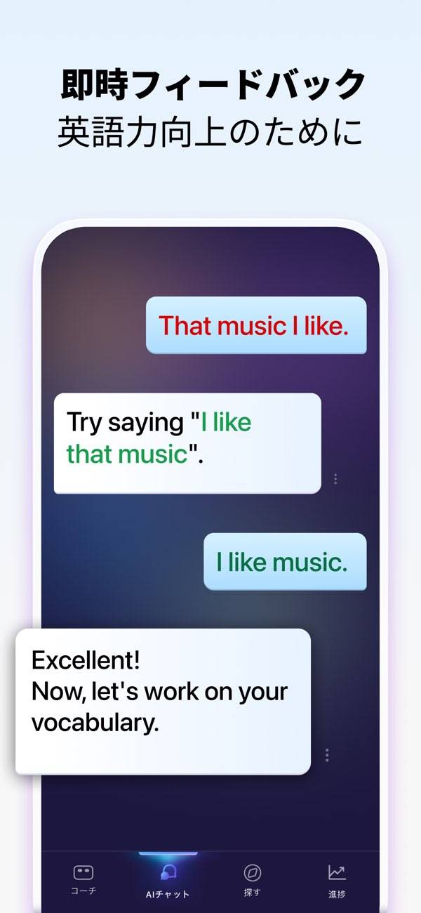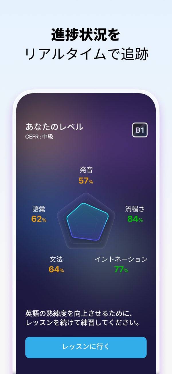 このアプリは、AI音声認識技術を用いた英語学習を行うことが可能です。発音プログラムでは、実際の自分の発音をもとにチェックし、間違えたところの改善案を示してくれます。
