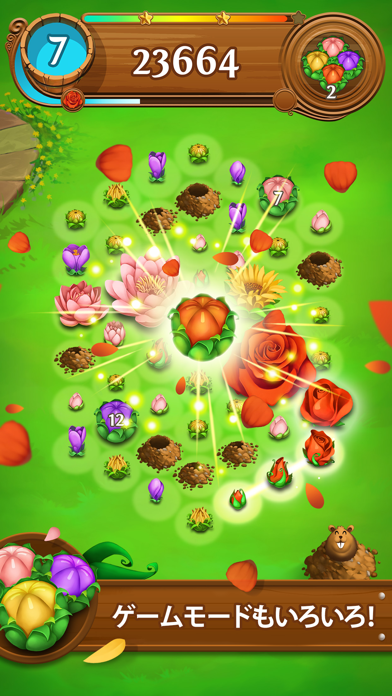 基本ルールは、花畑にある、同じ色のつぼみを3つ以上繋げるだけという非常にシンプルなもの。ですが、それだけで、次々に花が満開になっていき、まるで花火のスターマインのような気持ちよさがあります。