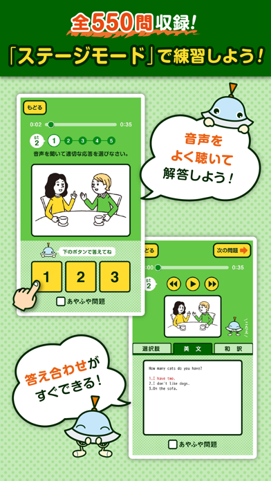 英検のリスニング問題を10回分、つまり全550問が無料で学習。イラストを見て答える形式から長文を聴いて質問に答える形式まで、試験内容に完全対応しています。550問もあれば、どんな問題にも対応できる力が身につきます。