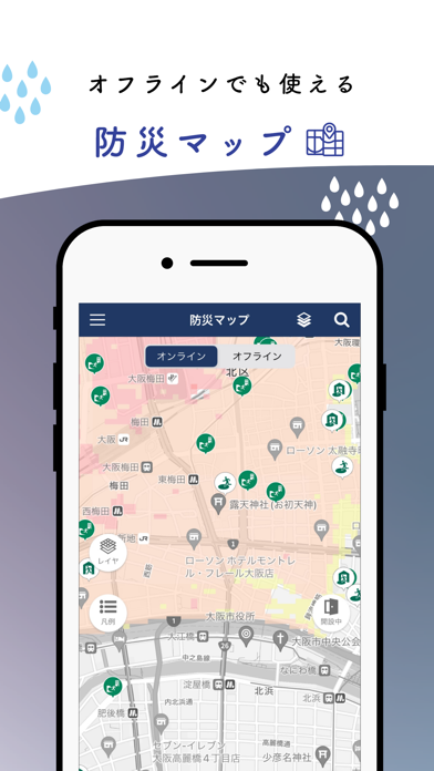 - 大阪市内の防災マップアプリ。避難所の表示やルート案内ができる