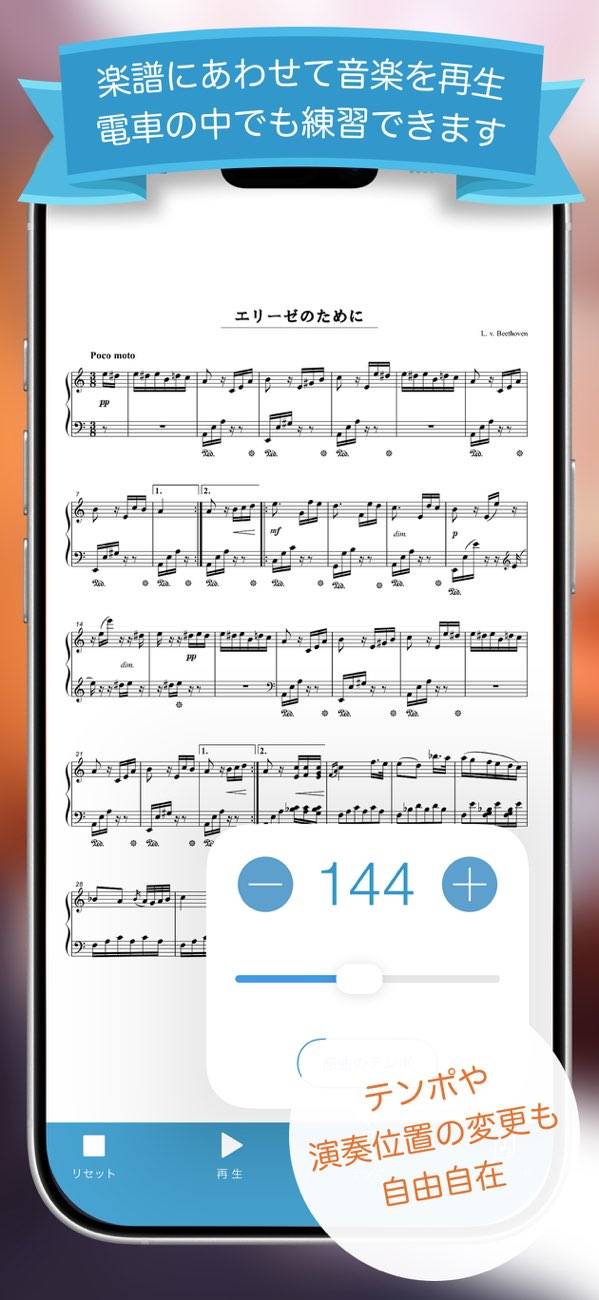 - 楽譜に合わせて音楽を再生し、自由に再生位置や速度を調整できる