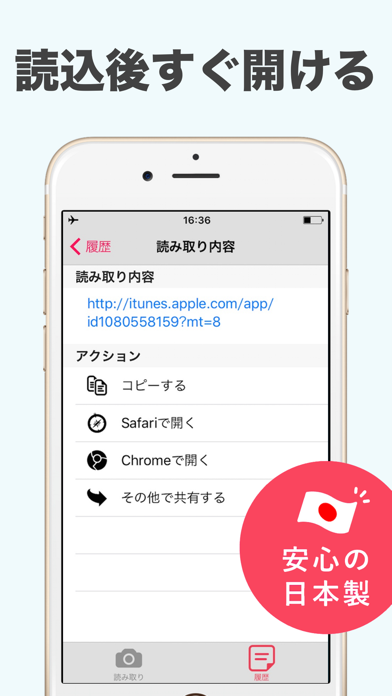 - 読み取ったコードはコピー、SafariやChromeで起動、共有などが可能