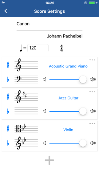 本アプリは自由度の高い楽譜作成機能が特徴的です。スコア設定からBPMの変更はもちろん、各パートのキーや拍子の変更も可能。また、最大8つのスタッフを同時に編集することができ、より細かい表現が可能となります。