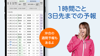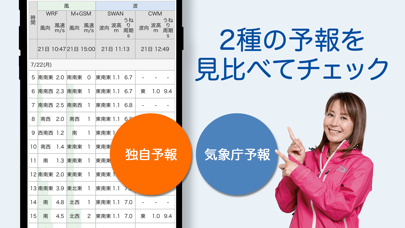 京都大学と共同で開発した独自予測データと気象庁の予測データを併記。2つの予報の傾向を確認することで、より確実性の高い気象情報を得られます。釣りやサーフィンなどの計画を立てるときに役立つでしょう。
