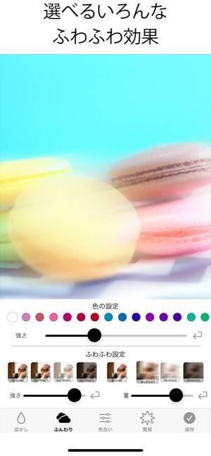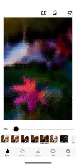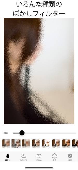 画像全体にぼかし加工を施せるアプリです。操作は簡単で、写真フォルダの中から画像を選び、フィルターを選んで調整するだけ。「ぼかし」と「ふんわり」フィルターは30種類以上あり、定番のものやモザイクの目が粗いもの、目が丸くなったもなどさまざま。シチュエーションに合わせて加工をかけられます。