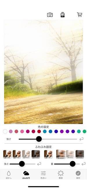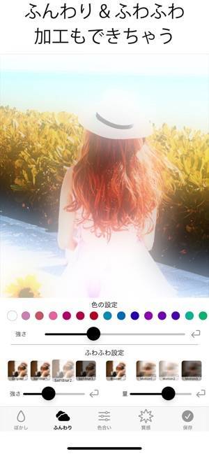 「ふんわり」フィルターを使えば、画像全体をふんわりとした雰囲気にできます。画像全体をふんわりさせれば、まるで映画のワンシーンのような仕上がりに。色の設定もできるのでピンク色でかわいらしく、緑色でフィルム風と、自分好みに変えられるのも魅力です。