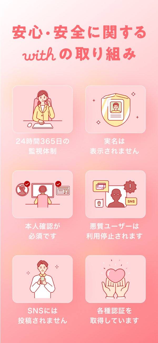 ブロック機能だけでなく、非表示にもできるので、ブロックで反感買いたくないけどメッセージを受け付けたくない時に、メッセージがきても表示されない、ミュートのような状態にできるのもよかったです。20代から30代の方がおおく、子供や結婚に対する価値観まで細かく書くことができる、withの通話機能もとても使いやすかったです。